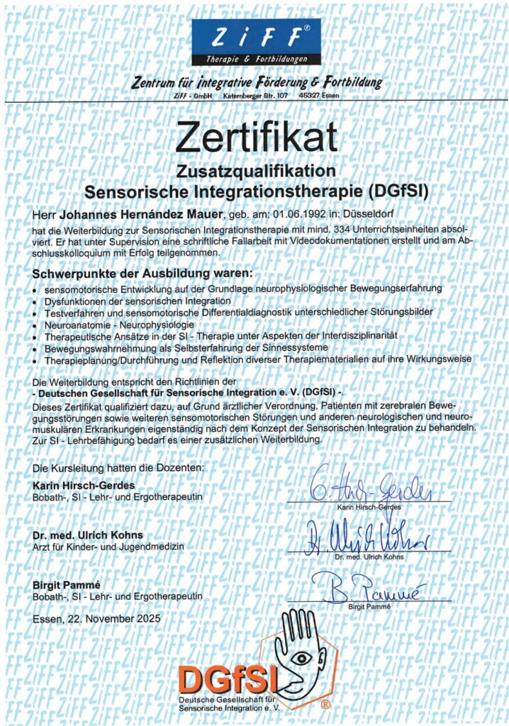 Johannes hat es nach 6 Jahren endlich geschafft. Er hat nun die Zusatzqualifikation Sensorische Integrationstherapie erhalten. Bei Fragen oder Bedarf gerne über den Kontaktbutton melden.
